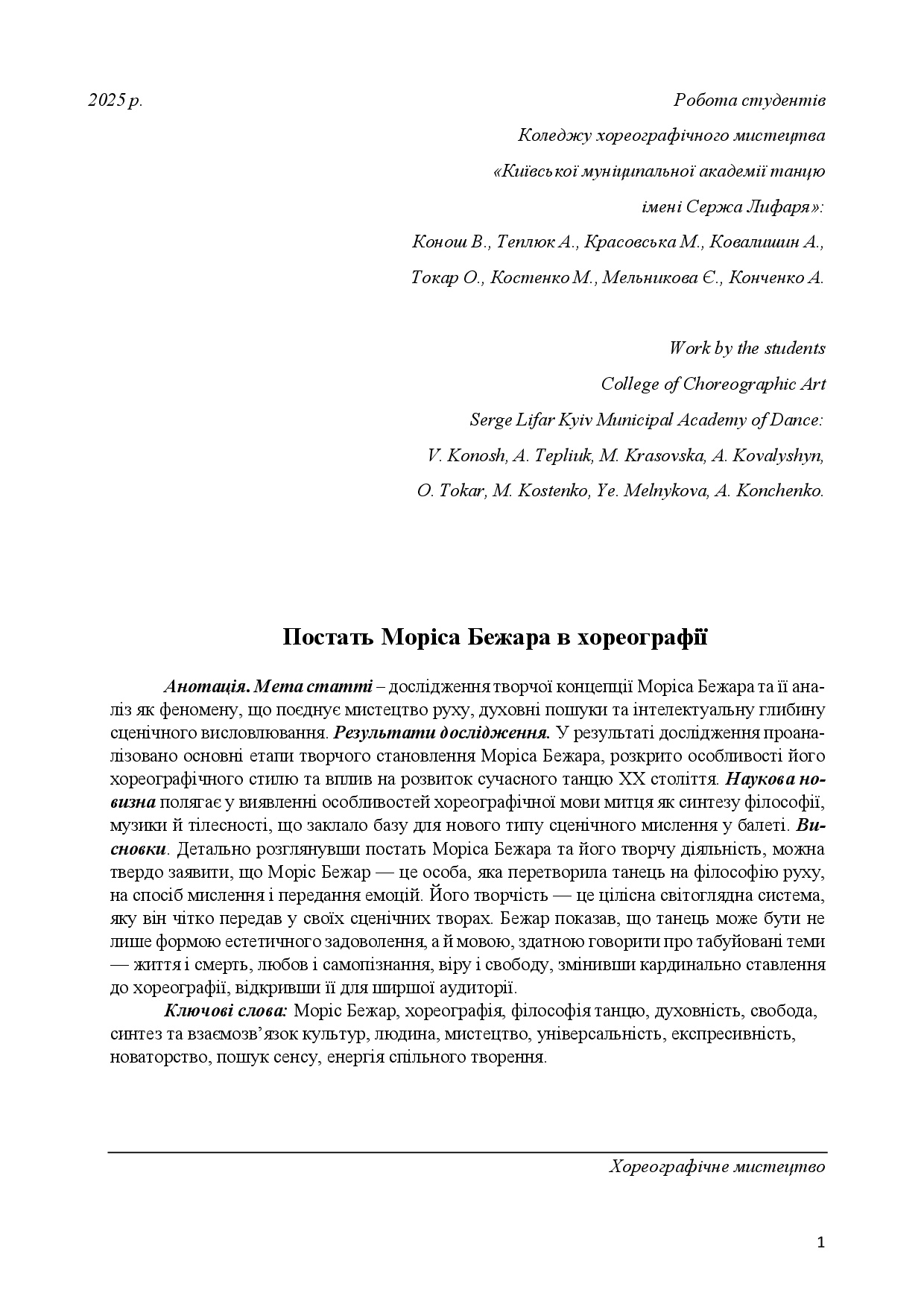 Документ Постать Моріса Бежара в хореографії Завантажити МетаданіURI (Уніфікований ідентифікатор ресурсу)https://rep.dance-academy.kyiv.ua/repozytorij/postat-morisa-bezhara-v-horeografiyi/НазваПостать Моріса Бежара в хореографіїАвториКовалишин Анна | Конош Вікторія | Конченко Анастасія | Костенко Меланія | Красовська Марія | Мельникова Єлизавета | Теплюк Анна | Токар ОльгаВидавецьКоледж хореографічного мистецтва «Київська муніципальна академія танцю імені Сержа Лифаря»Офіційне посиланняhttps://rep.dance-academy.kyiv.ua/repozytorij/postat-morisa-bezhara-v-horeografiyi/АнотаціяМета статті – дослідження творчої концепції Моріса Бежара та … Читати далі Постать Моріса Бежара в хореографії